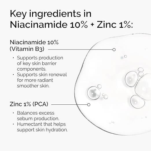 Содржи 10% ниацинамид (витамин B3) и 1% цинк PCA, кои помагаат во регулирање на маснотијата, намалување на појавата на пори и подобрување на чистотата на кожата.